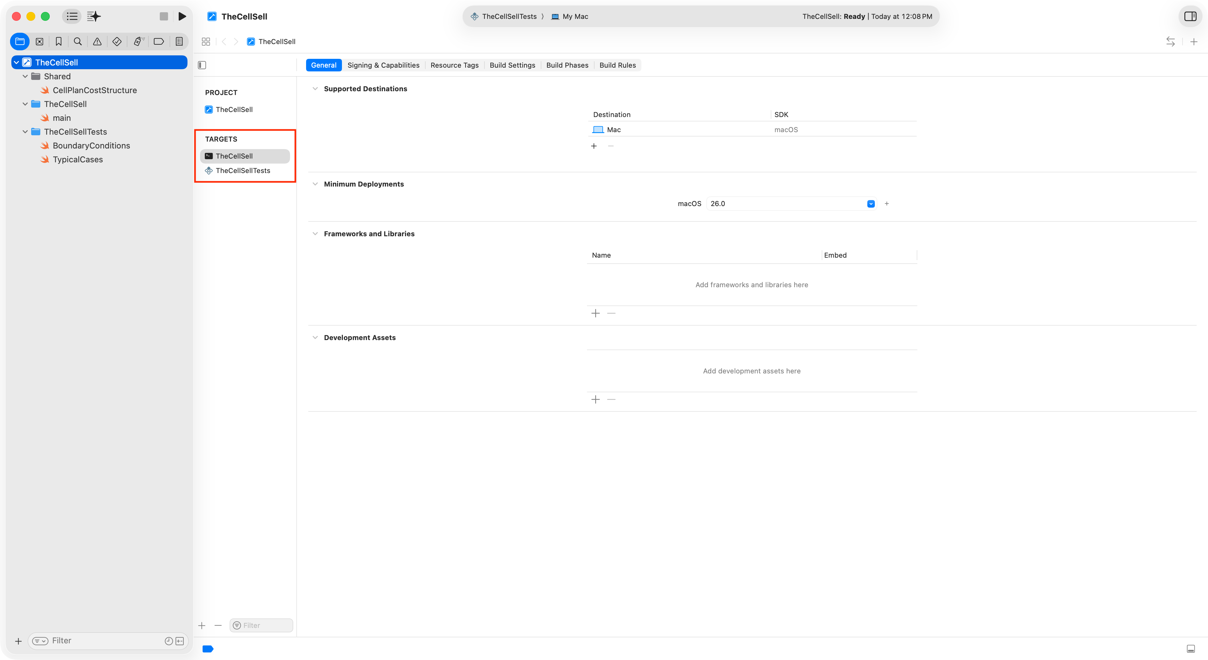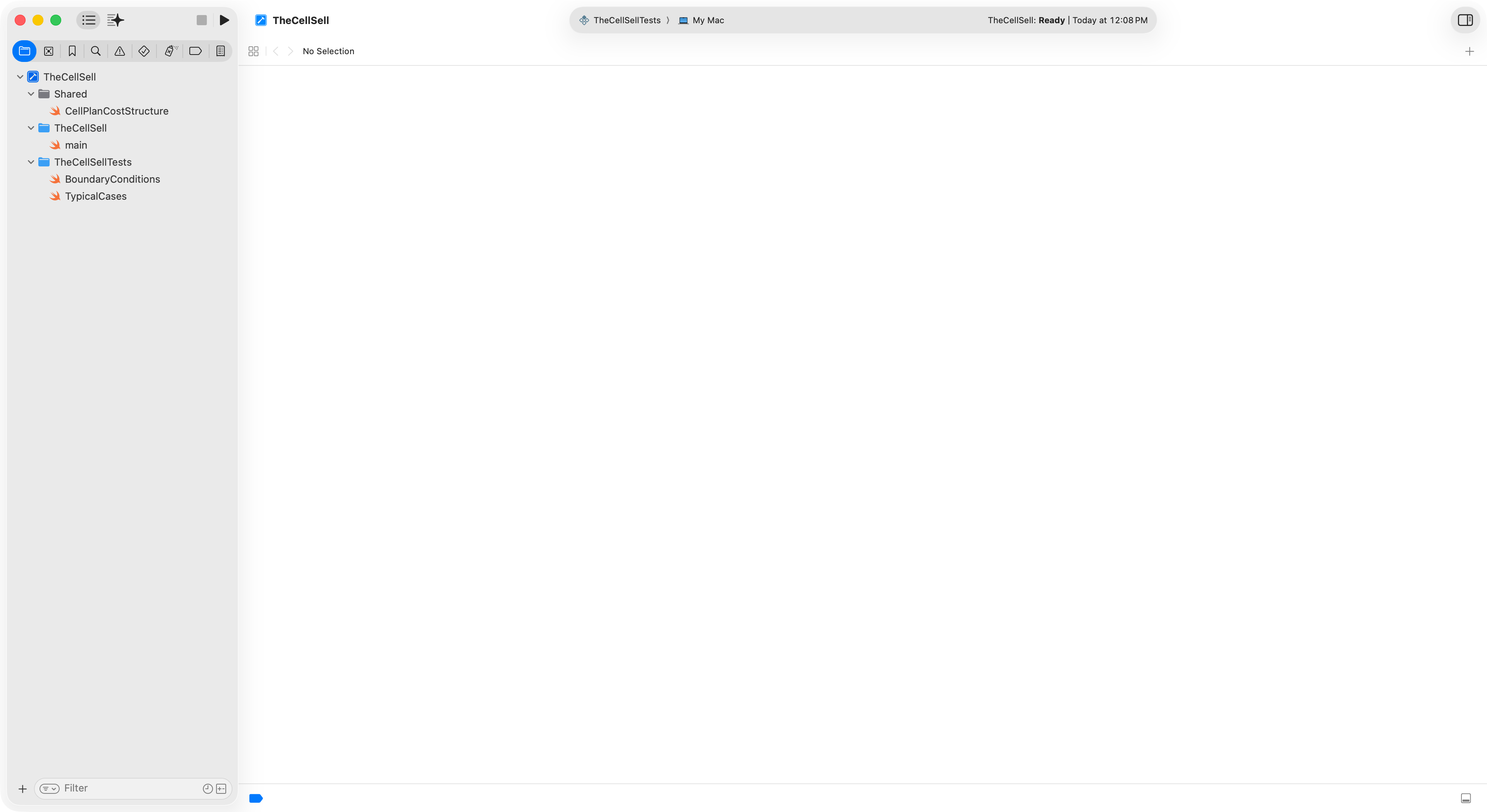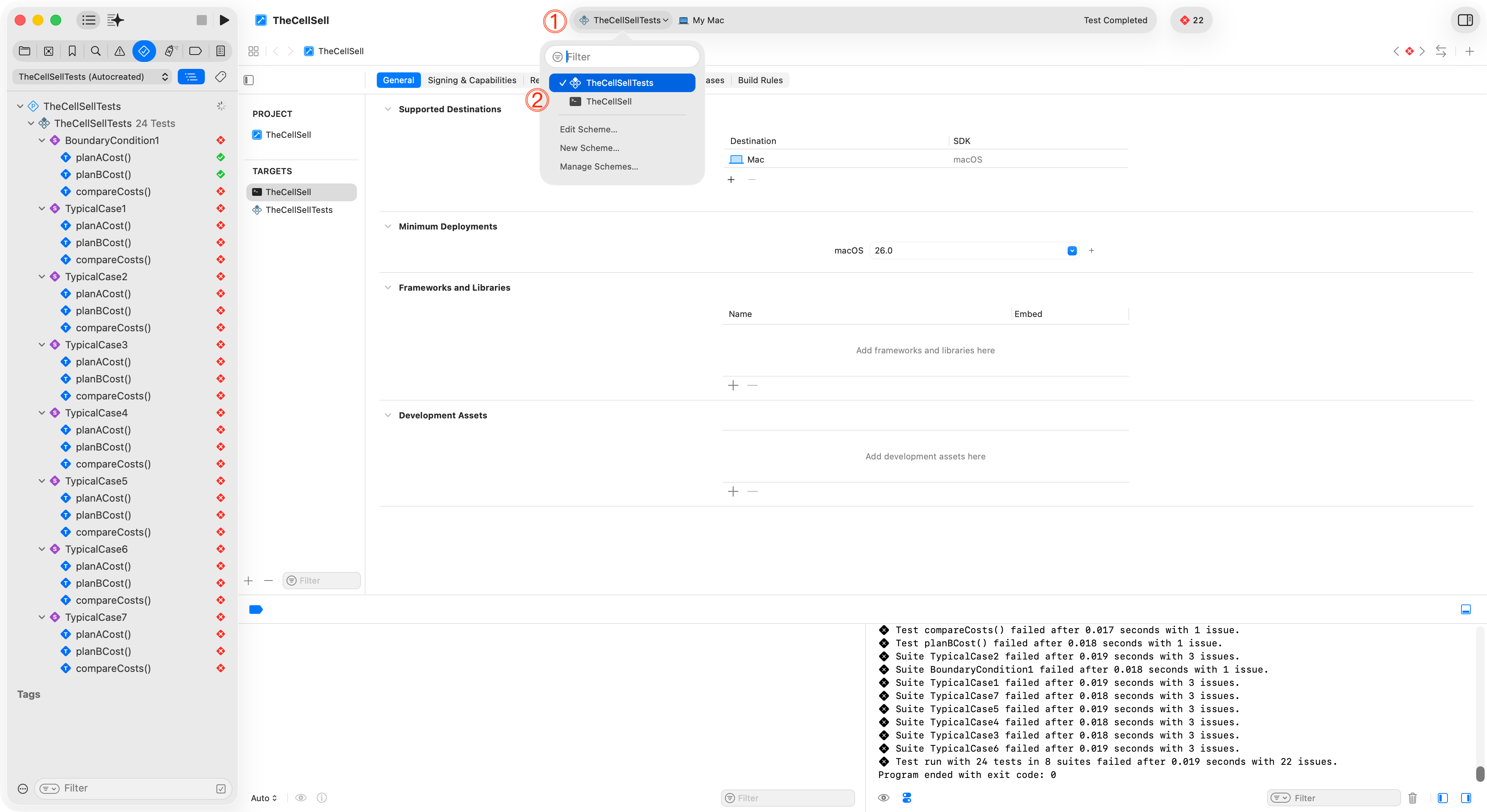Be selecting TheCellSellTests scheme, following this two-step click process, then pressing Command-U, you can run all of the defined unit tests: