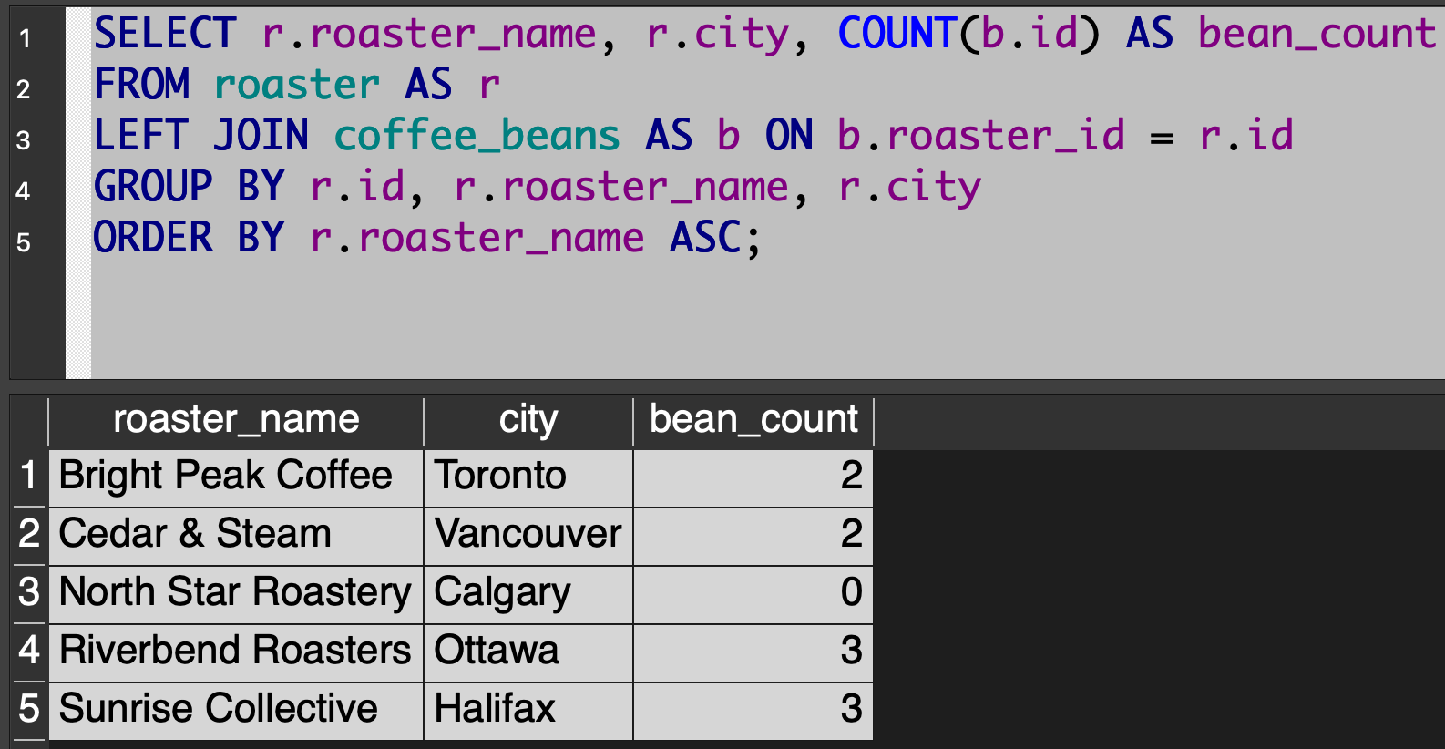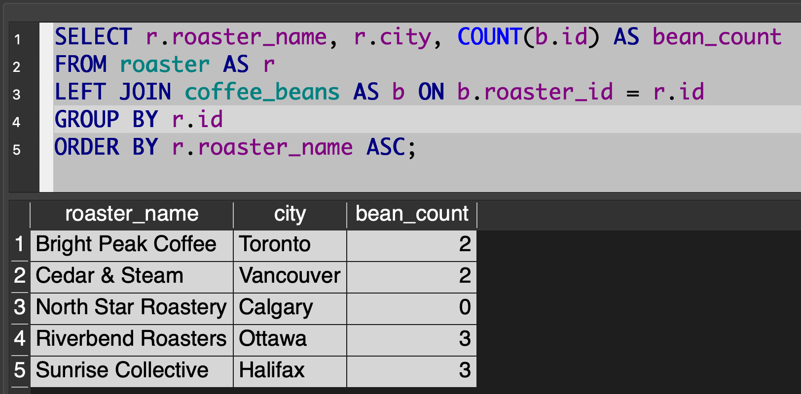 The bonus question, number 8, involved writing a query to count the number of blends made by each roasting company, including companies that exist but do not (currently) sell any blends of coffee. This question existed, in part, to check that you know when to use a LEFT JOIN.