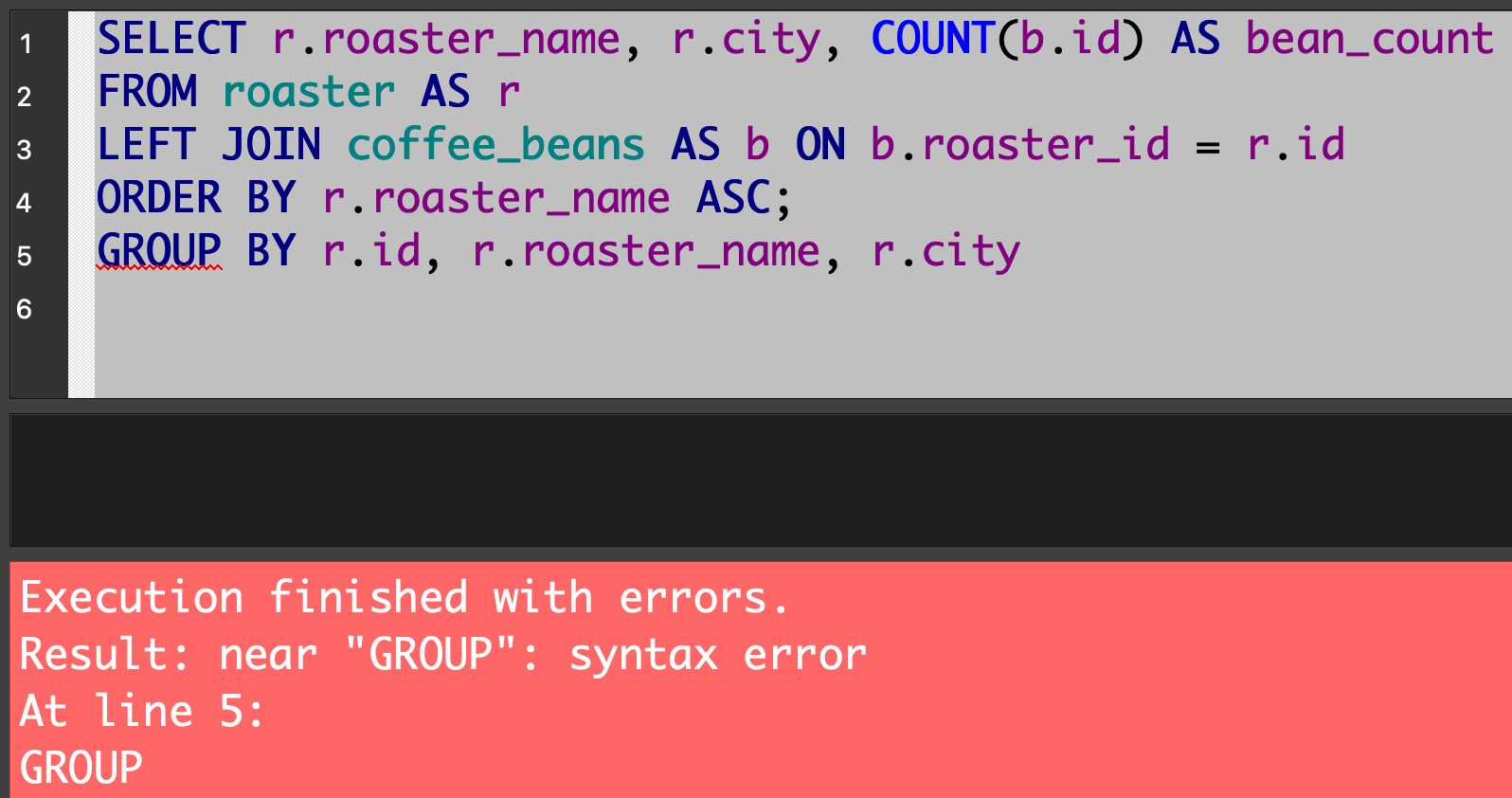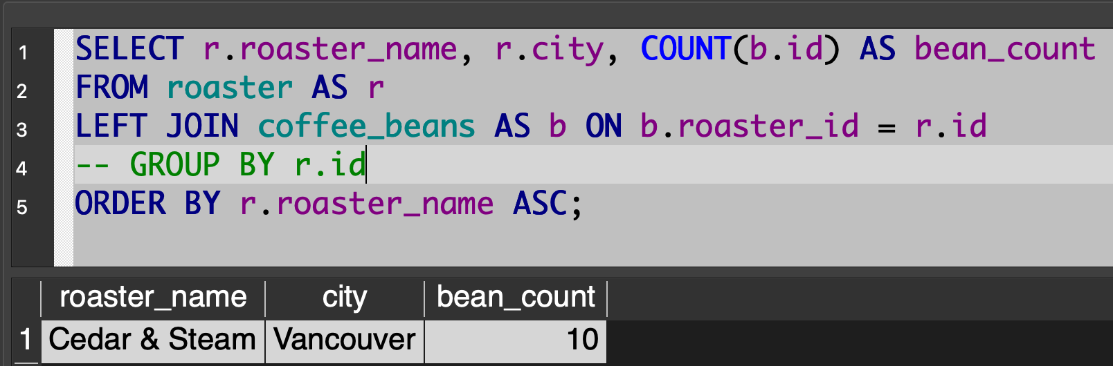 When grouping, some students chose to group based on the names of the roasting companies. This is not a great practice – imagine if (with a larger data set) we had multiple roasting companies with the same name (but perhaps in different cities). It’s therefore better to group based on the unique identifier for each roasting company in the database: roaster.id. In this way, even if two roasting companies had identical names, we’d get an accurate count of how many bean blends each company has made.