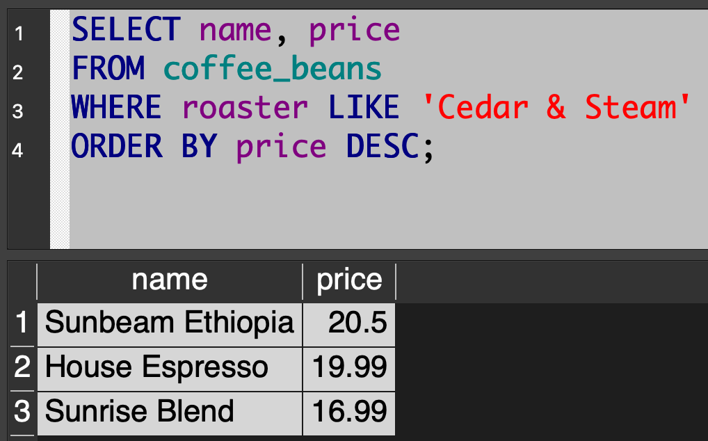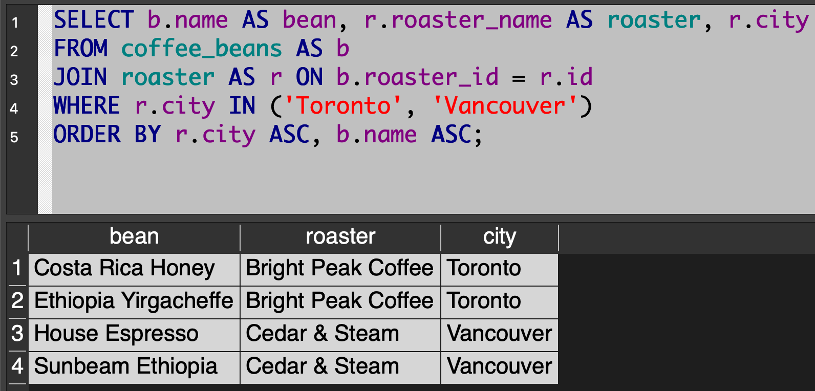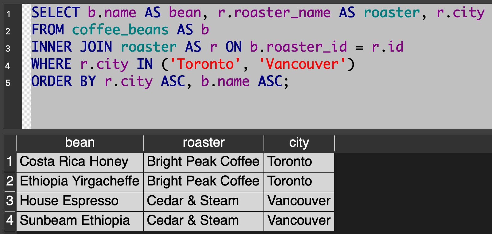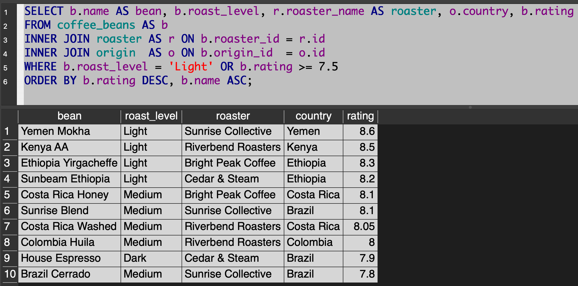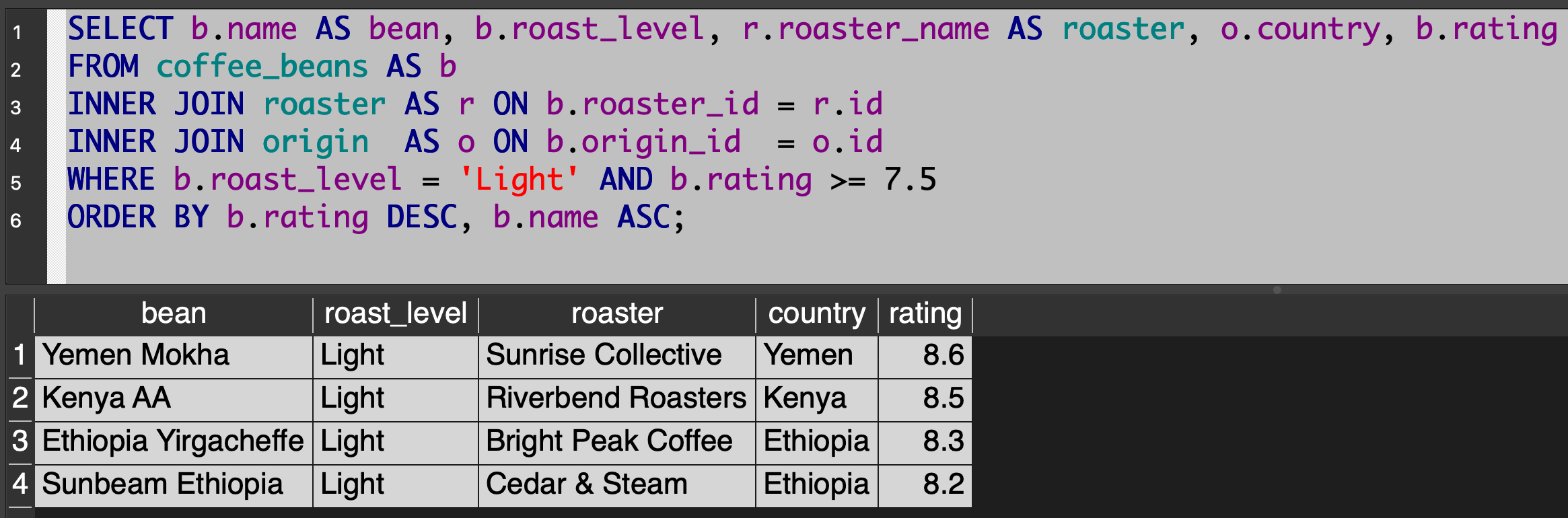 Here is a query with the order of the tables reversed – notice how the query selects first from the coffee_beans table – when we do this, the roasting company North Star Roastery, which has no bean blends on the market at present, is omitted: