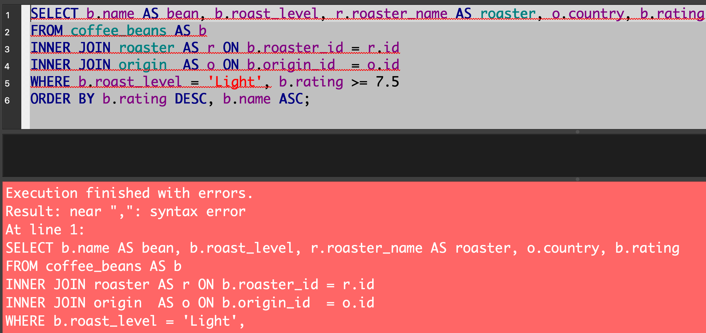 If you are using multiple criteria to indicate what rows should be retained while using a WHERE clause, you must use AND or OR to do so. A comma is ambiguous – the database doesn’t know whether you mean AND – do both criteria have to be true to include the row – or OR, as when either the first criteria or the second criteria could be true to include the row.